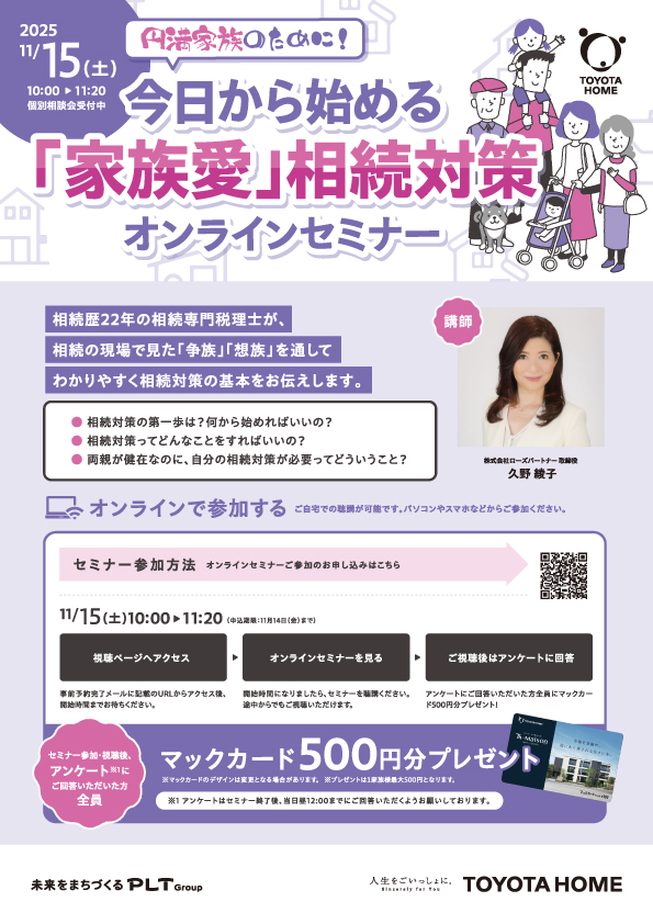 イベント情報 イベント 今日から始める「家族愛」相続対策オンラインセミナー イベント 今日から始める「家族愛」相続対策オンラインセミナー ━━━━━━━━━━━━━━━━━━━━━━━━━━ \円満家族のために!/ 今日から始める 「家族愛」相続対策 オンラインセミナー ━━━━━━━━━━━━━━━━━━━━━━━━━━ 相続歴22年の相続専門税理士が、 相続の現場で見た「争族」「相族」を通して わかりやすく相続対策の基本をお伝えします。 【日時】 2025年11月15日(土) 10:00 ▶ 11:20 【お申込み方法】 専用フォームよりお申込みください。 お申し込みはこち 【参加方式】 ■オンライン 予約フォームよりお申し込み後、視聴用URL をお送りします。 ∴‥∵‥∴‥∵‥∴‥∴‥∵‥∴‥∵‥∴‥∴‥∵‥∴‥∵‥∵ セミナー参加・視聴後、 アンケートにご回答いただいた方全員に マックカード500円分プレゼント ※アンケートはセミナー終了後、当日昼12:00までにご回答いただくようお願いしております。 ※プレゼントは1家族様最大500円までとなります。 ∴‥∵‥∴‥∵‥∴‥∴‥∵‥∴‥∵‥∴‥∴‥∵‥∴‥∵‥∵ 更新日時 2025年09月26日 一覧に戻る